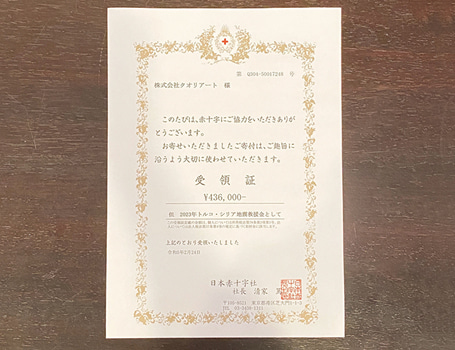 また本展では出展作品がプリントされたオリジナルポストカードを販売。会期終了後、株式会社クオリアート代表取締役社長の櫛田英俊氏が日本赤十字社本社を訪問され、ポストカードの売上金を、現地時刻2月6日にトルコ国境付近で発生した大地震に伴う救援金として「2023年トルコ・シリア地震救援金」へ全額寄付いただきました。